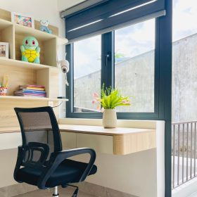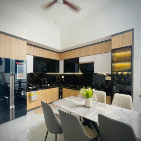 Với thiết kế hiện đại mang gam màu trắng sáng kết hợp màu gỗ tự nhiên. Tầng 1 là shop quần áo trẻ em. Trên lầu là khu vực sinh hoạt chung của gia đình. Căn bếp được thiết kế lệch tầng, tối giản mang một cảm giác ấm cúng và đẹp mắt. Các không gian được kết nối một cách hài hòa, gia chủ có thể nhìn toàn cảnh shop trong lúc ăn uống ở tầng trên. Căn nhà gồm 3 phòng ngủ, 2 WC, 1 phòng thờ và một khu vườn nhỏ sau nhà. Mỗi phòng là mỗi layout được bố trí rất khéo và đầy đủ công năng. Một mẫu nhà đang được được rất nhiều người ưa chuộng!