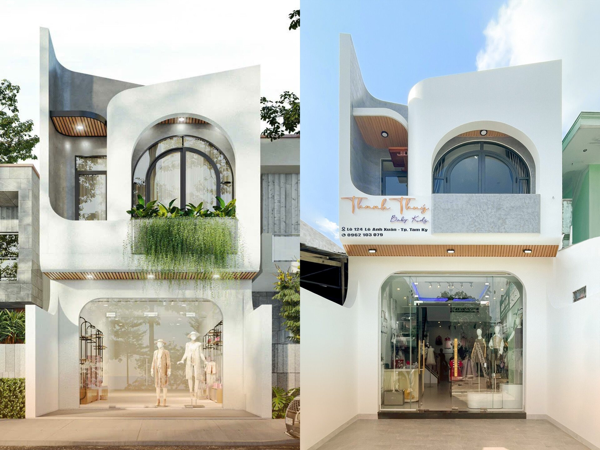 Với thiết kế hiện đại mang gam màu trắng sáng kết hợp màu gỗ tự nhiên. Tầng 1 là shop quần áo trẻ em. Trên lầu là khu vực sinh hoạt chung của gia đình. Căn bếp được thiết kế lệch tầng, tối giản mang một cảm giác ấm cúng và đẹp mắt. Các không gian được kết nối một cách hài hòa, gia chủ có thể nhìn toàn cảnh shop trong lúc ăn uống ở tầng trên. Căn nhà gồm 3 phòng ngủ, 2 WC, 1 phòng thờ và một khu vườn nhỏ sau nhà. Mỗi phòng là mỗi layout được bố trí rất khéo và đầy đủ công năng. Một mẫu nhà đang được được rất nhiều người ưa chuộng!
